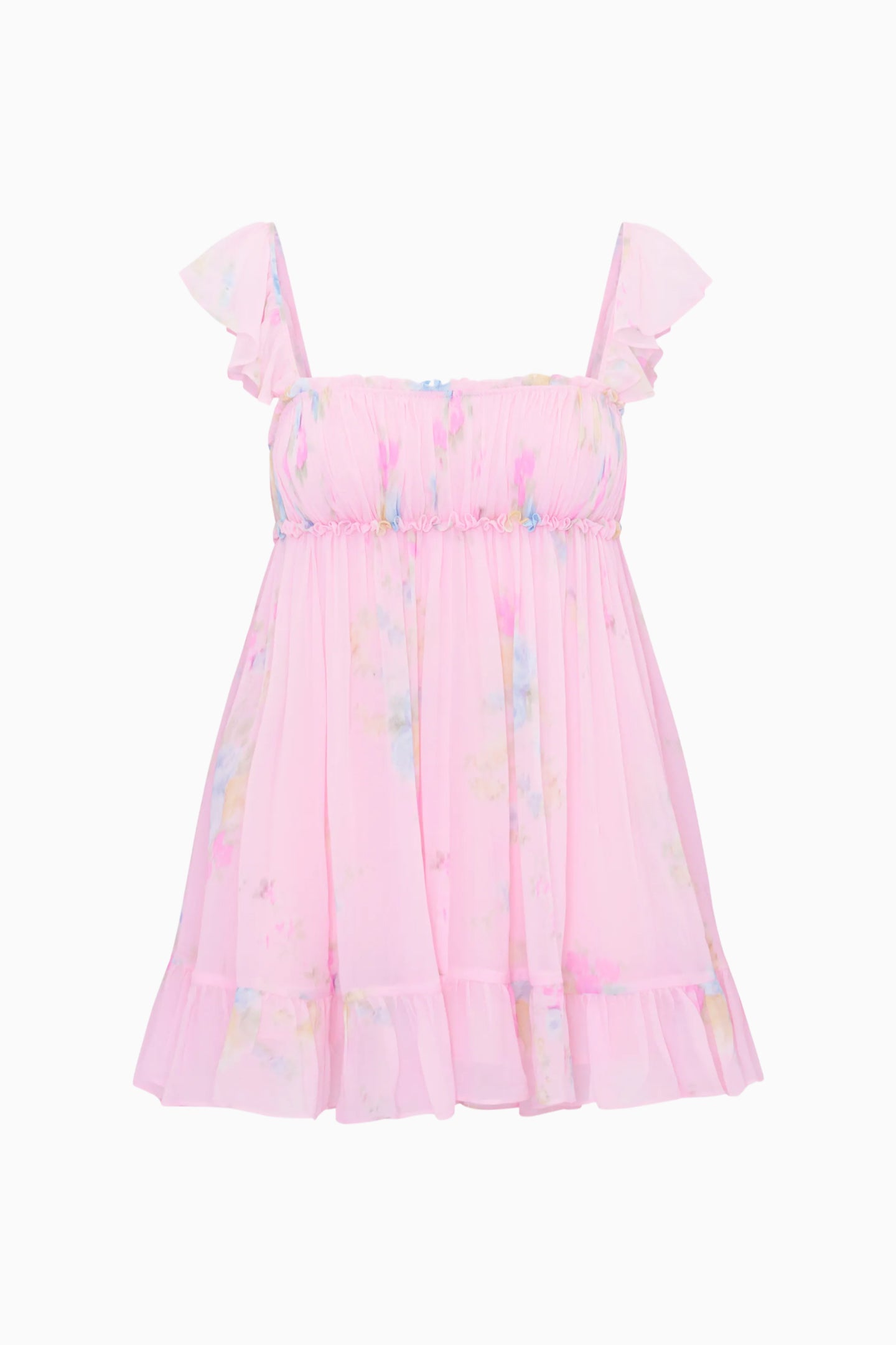 The Zanira Dress is cut in a fit-and-flare mini silhouette that moves with airy ease. A square neckline frames the bodice, detailed with flutter sleeves and soft ruffles tracing the straps. The pastel floral print adds a whimsical charm, while the ruffled hem keeps it romantic.