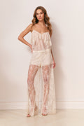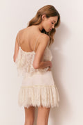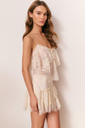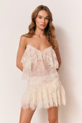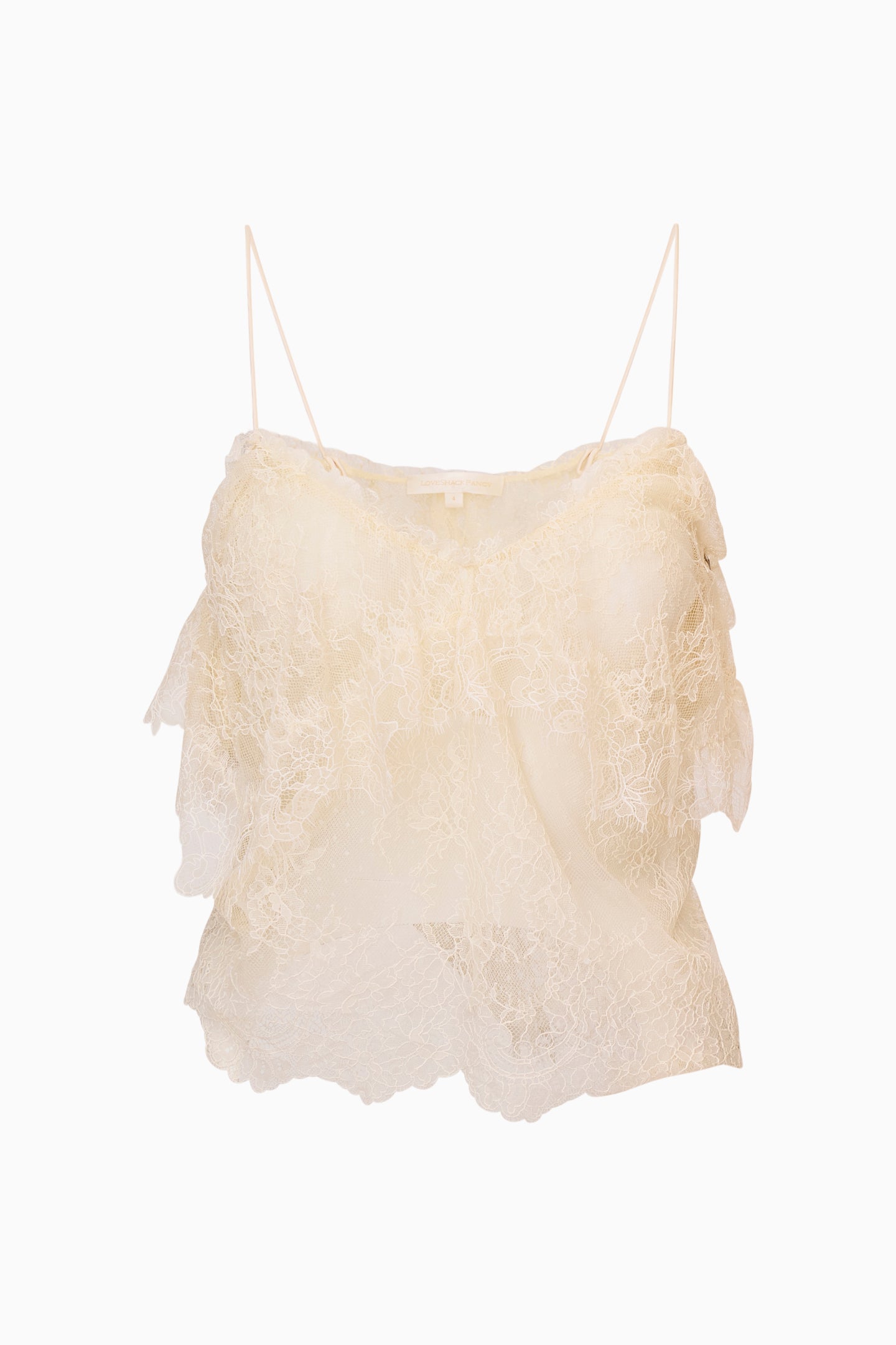 A vision in chantilly lace, the Zhanya Top is a bohemian dream come true. This handkerchief-style cami drapes effortlessly with cascading lace that floats around the body. Tiny, delicate spaghetti straps adjust with a charming loop-tie detail at the back, while a hidden side zipper offers a secure fit. Designed to be worn loose and breezy, this ethereal piece feels both romantic and undone—perfect for day-to-night enchantment.