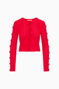 Charming and whimsical, the Zoriah Cardigan is crafted from stretchy rib pointelle for a slim, compact fit with a soft, flattering drape. Featuring keyhole cutouts along the sleeves, each accented with delicate bows, this cardigan adds subtle, playful detailing. Snaps down the front allow for easy wear, while a high crewneck and signature scalloped trim elevate the classic silhouette. The ribbed pointelle stitch throughout provides texture, and stretch. Pair with the Garrett Top and Meryl Skirt for a full set.
