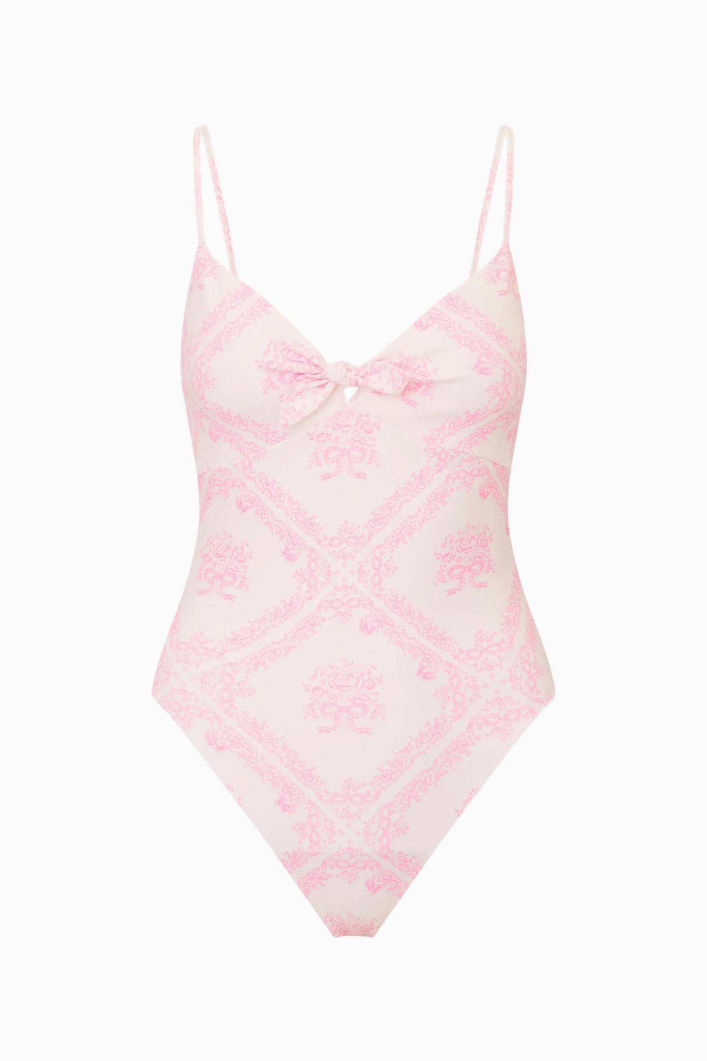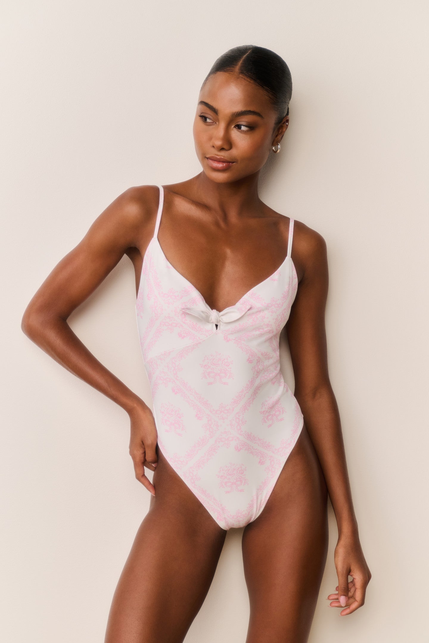 The Zyra One-Piece Swimsuit features a flattering high-leg cut and moderate coverage. A knotted front detail and delicate toile print bring a signature romantic charm. Adjustable straps ensure a comfortable, effortless fit for sun-soaked days.